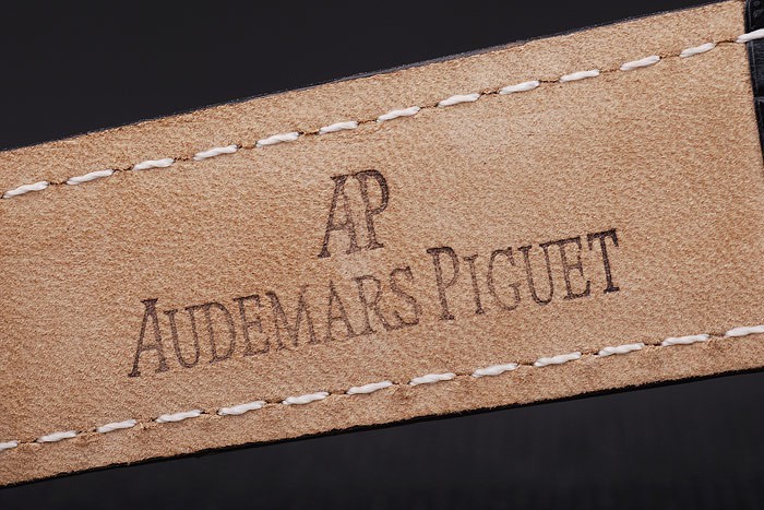 Armband: Schwarz Krokodillederband mit weißen Nähten und Wärme geprägt Audemars Piguet Name und das logo und ein Audemars Piguet beschriftet Edelstahl Flip-über Haken clasp