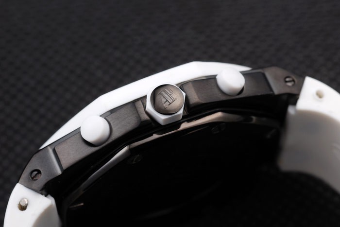 Krone: weiße Gummi hexagonal Krone mit der Initialen AP auf Edelstahlbolzen sowie einem weißen runden Gummi Krone auf beiden Seiten des it