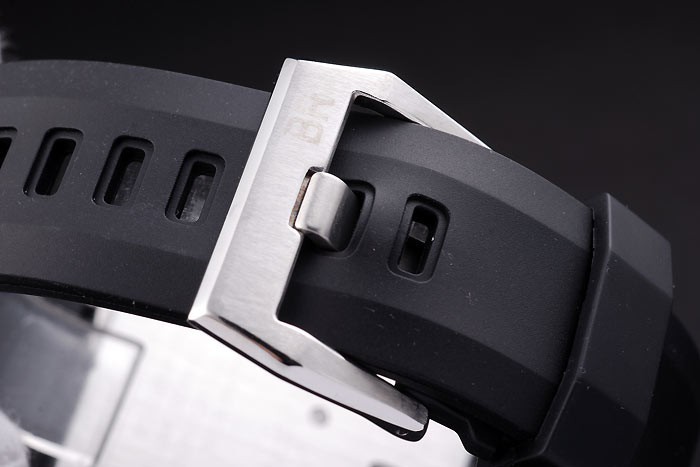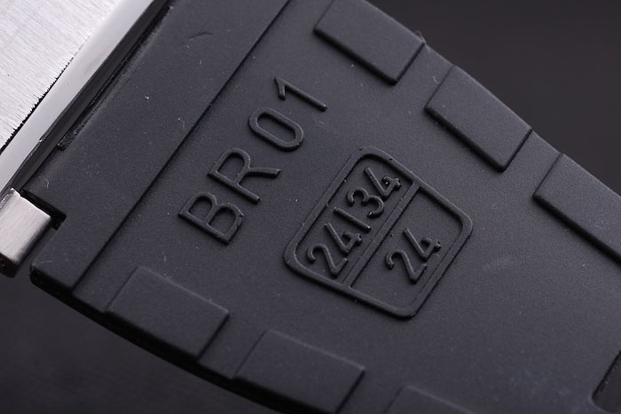Armband: Schwarzes Kautschukband mit Wärme geprägtes Logo, Modellnummer und Produktcode und BR graviert Rosen vergoldet Haken-Schließe