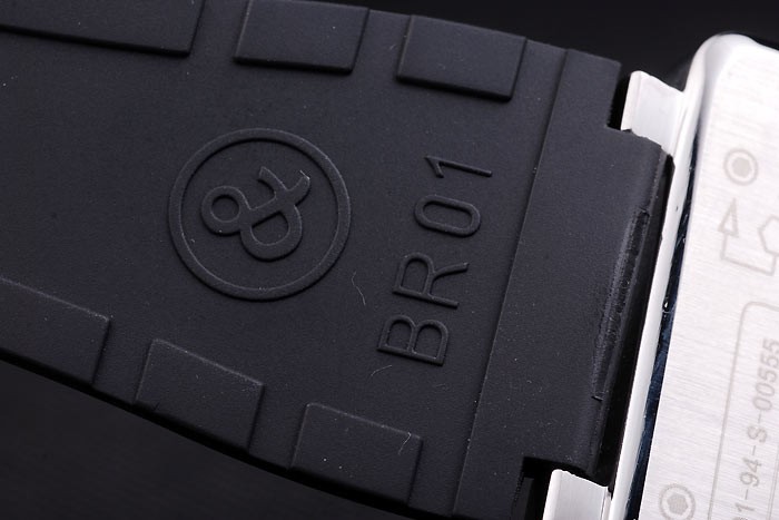 Armband: Schwarzes Kautschukband mit Wärme geprägtes Logo, Modellnummer und Produktcode und BR graviert gebürstetem Edelstahl Haken-Schließe