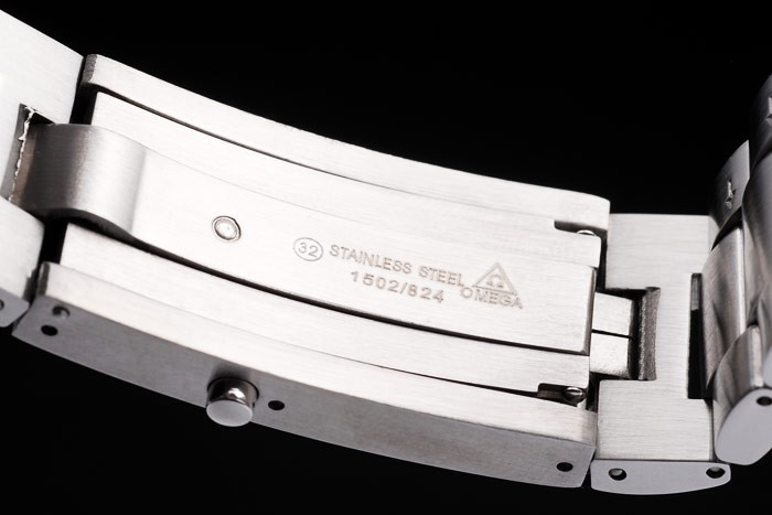 Armband: gebürstetes Edelstahl-Gliederarmband mit Omega bezeichnet Überfaltposition Push-Release clasp