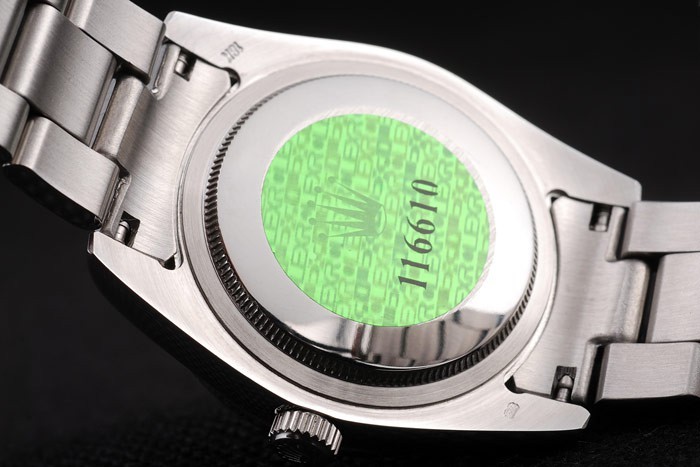 Rückseite: Edelstahl Push-Gehäuseboden mit grünen Rolex-Logo stamp