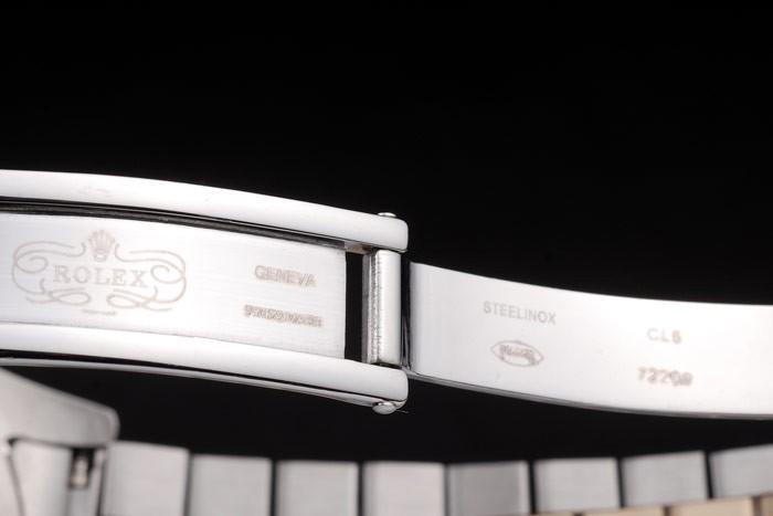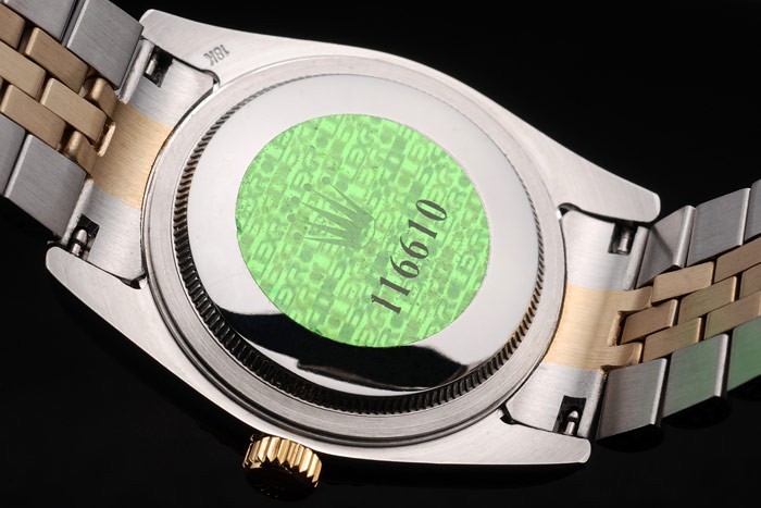 Rückseite: Edelstahl Push-Gehäuseboden mit grünen Rolex-Logo stamp