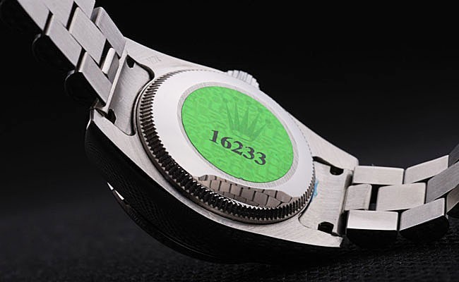 Rückseite: Edelstahl Push-Gehäuseboden mit grünen Rolex-Logo stamp