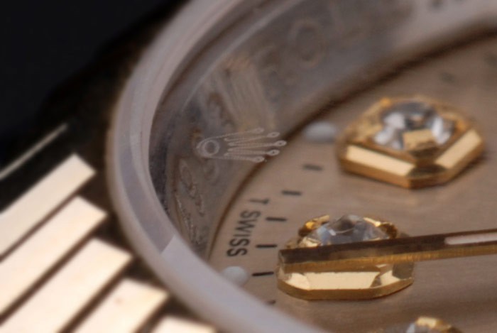 Rückseite: Edelstahl Push-Gehäuseboden mit grünen Rolex-Logo stamp