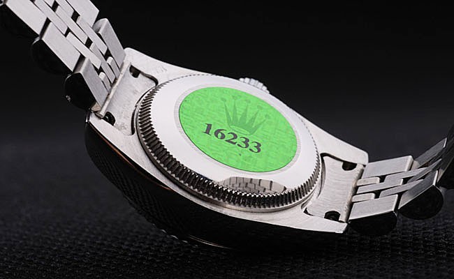 Rückseite: Edelstahl Push-Gehäuseboden mit grünen Rolex-Logo stamp