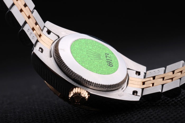 Rückseite: Edelstahl Push-Gehäuseboden mit grünen Rolex-Logo stamp
