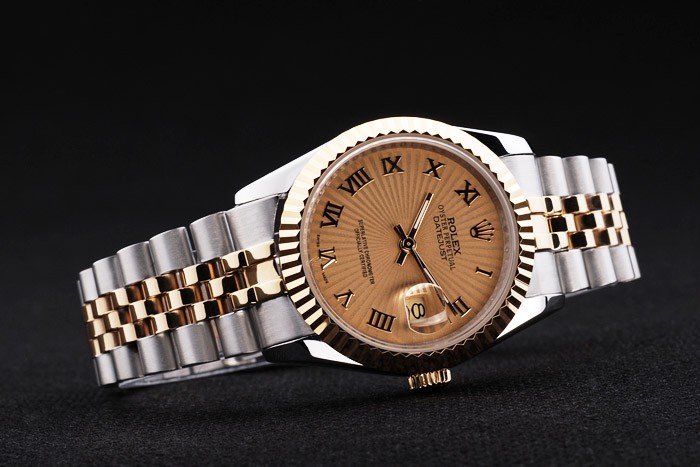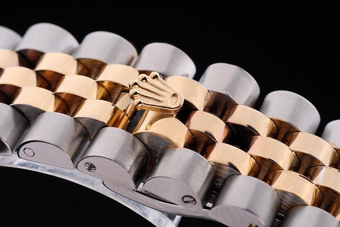 Armband: Zwei getönten Gliederarmband aus gebürstetem Edelstahl und 18 Karat Gelbgold überzogenem Stahl mit Rolex Gravur versteckte Spange Anzeigen der Rolex logo