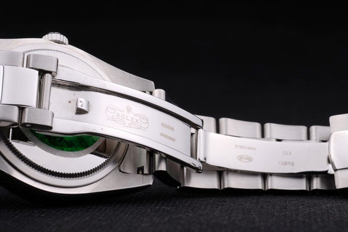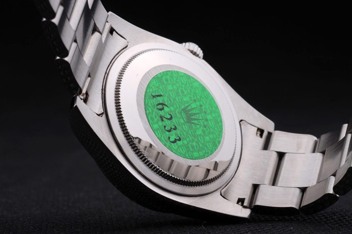 Rückseite: Edelstahl Push-Gehäuseboden mit grünen Rolex Gravur stamp