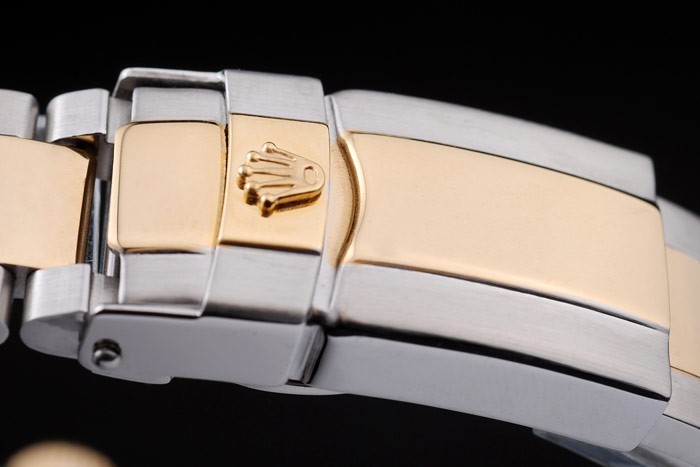 Armband: Edelstahl gebürstet und Rose-Gold-Gliederarmband mit Rolex Gravur im Inneren des Faltschließe und Rolex-Logo auf top